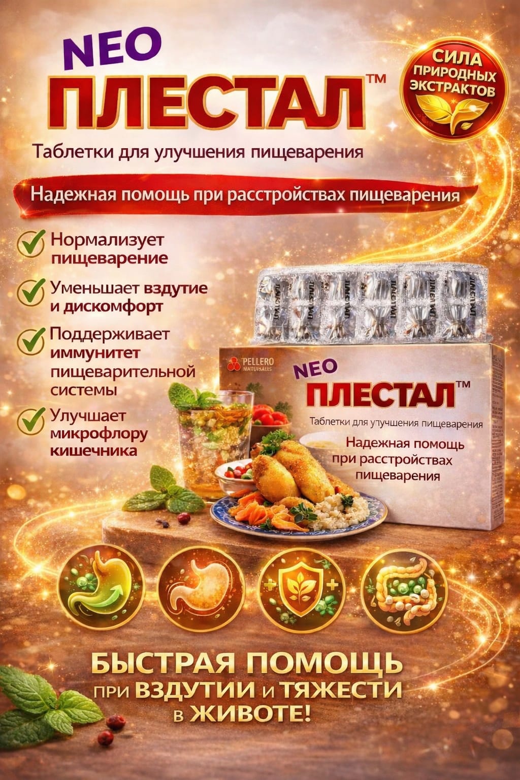 Neo PLESTAL se utilizează pentru ameliorarea şi prevenirea tulburărilor digestive asociate cu scăderea funcţiei pancreasului, stomacului, intestinului subţire, ficatului şi vezicii biliare. Neo PLESTAL este prescris pentru insuficienţa pancreatică exocrină şi pentru îmbunătăţirea digestiei în caz de supraalimentare, nutriţie neregulată, cu imobilizare prelungită şi reabilitare după boli grave. Neo PLESTAL reduce simptomele de flatulenţă şi balonare asociate cu digestia deteriorată a alimentelor. Neo PLESTAL este, de asemenea, utilizat în pregătirea pentru examinarea cu raze X a organelor abdominale. În plus, Neo PLESTAL elimină senzaţia de greutate în stomac la femeile însărcinate.