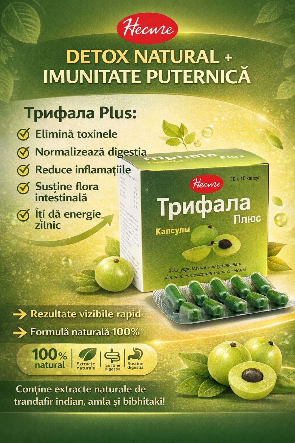 Indicatii terapeutice: Triphala vine din sanskrita, se traduce “3 fructe” si este un amestec din fructe de Emblica Officinalis Terminalia belerica si Terminalia chebula, amestec mentionat in cele mai vechi scrieri din traditiile Ayurvedice. Datorita multiplelor sale proprietati si a continutului sau bogat in vitamin C Triphala Plus imbunatateste digestia, curata si protejeaza colonul, imbunatateste absorbtia nutrietilor, combate viermii intestinali, arde grasimile nedorite, corecteaza refluxul gastric si constipatia. Deasemenea acest complex este foarte util in tratarea afectiunilor hepatice, renale, cardiace, in cazul depresiilor, migrenelor, cefaleelor, intinereste celulele creierului, imbunatateste memoria, puterea de concentrare, menține calitatea somnului. si este de un real ajutor in cazul disfunctiilor sexuale. Totodata ajuta in lupta impotriva formarii celulelor canceroase, a infectiilor tractului urinar, util în tratamentul artritei, guta, a bolilor oculare a glaucomului, protejeaza organismal de radiatii.