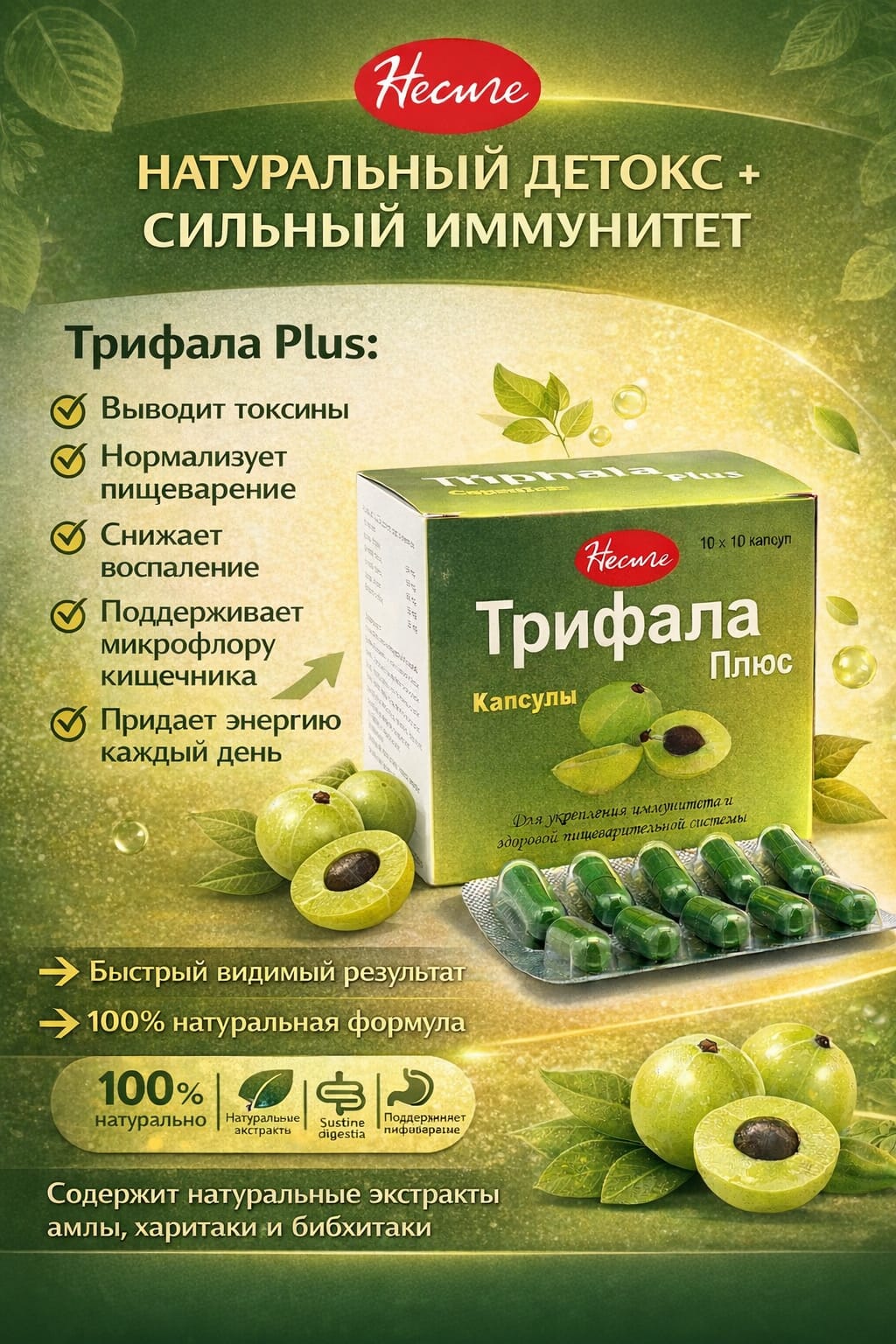 Emblica Officinalis: Este o bogata sursa de vitamina C și are proprietăți antioxidante, antibacteriene, antivirale, antipiretice, antifungice, antidiabetice, antitusive, hepatoprotectoare, radioprotectoare, diuretice și digestive. Acest ingredient este util în tratamentul artritei, bolilor oculare, glaucomului, afecțiunilor hepatice, icterului, diabetului, astmului, bolilor pulmonare, bronșitei, constipației, afecțiunilor digestive, candidozelor, căderii părului, bolilor de inimă, pietrelor renale și problemelor urinare. Detine o eficienta sporita in reducerea nivelului trigliceridelor din sânge, reducerea LDL și asigura creșterea celulelor albe si a nivelului de hemoglobina. Previne formarea celulelor canceroase, protejează împotriva radiațiilor, previne infarctul miocardic, arde grăsimile nedorite din organism, vindecă obezitatea, regularizeaza mișcările intestinului, normalizează tensiunea arterială, îmbunătățește imunitatea, rezolvă problemele gastritei și a refluxului gastric.